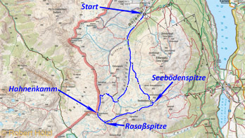 | Aufstieg | ca. 1300 Hm, 4 Stunden 25 Minuten (2 Stunden 45 Minuten bis Seebödenspitze, 1 Stunde 40 Minuten bis Rasaßspitze) |