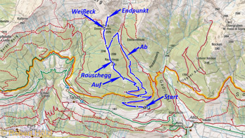| Abstieg | ca. 990 Hm, 2 Stunden 15 Minuten |