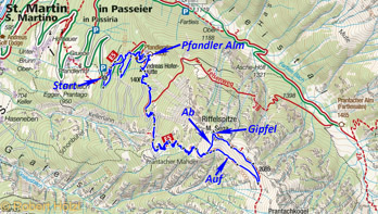 | Ausgangspunkt | Parkplatz Pfandler Alm (1100 m) | Stützpunkt | Pfandler Alm, geöffnet Anfang Mai bis Ende Oktober (1350 m) |