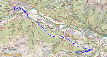 | Persönliche Bewertung | * ca. 17 km; Wanderweg auf größtenteils breiten Fahr- und Forstwegen, relativ viel Teerstraße; praktisch die ganze Zeit im Schatten, da nordseitig. |