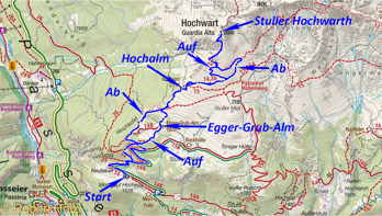 Eigentlich haben wir das Hohe Joch im Vinschgau (ein Vorgipfel das Madatschknott) ins Auge gefaßt und starten deshalb um halb acht von zu Hause. Da dabei aber über 1250 Hm zu machen sind, disponieren wir schnell um und wählen die Stuller Hochwarth in Passeier aus (Vorschlag Bernd). Wir waren vor 11 Jahren schon mal da oben (Bernd öfter), aber damals war im Gipfelbereich eher schlechtes Wetter. Wir gehen um dreiviertel neun vom kleinen Parkplatz vor dem Neubauer aus. Wie auch letztes Mal haben wir nicht genug Münzen und so geht Bernd zum Hof, um zu wechseln. Auf der Teerstraße am Hof vorbei; bald nach dem Hof beginnt die Forststraße, die aber auch geteert ist, da sie zu den verschiedenen Almen mit Gastbetrieb und den ausgebauten Mahdern führt. Wir bleiben auf der Forststraße, die dann irgendwann auf Schotter wechselt. Drei Autos überholen uns. E rst kurz vor der Egger-Grub-Alm wechseln wir auf den Steig 14 der direkt zur Alm führt. Auf der Alm wird geschäftig gearbeitet, um sie auf die Winteröffnung am 27.11.2025 vorzubereiten. An der Alm vorbei geht es weiter aufwärts, wir queren den Passeirer Höhenweg und folgen dem Steig entlang des Waldrandes bis zur Hochalm (wird als Schutzhaus bezeichnet), die ebenfalls geschlossen ist und anscheinend keine Wintersaison hat. Ein Stück geht es auf dem Steig 14/26, der die Hänge unter der Hochwarth leicht ansteigend nach Osten quert. Wir kommen zu einer Abzweigung ohne Hinweisschild; der Steig ist aber markiert. Auf den meisten Karten in der App "Outdoor Active" ist dieser Steig nicht eingezeichnet, nur in der Open-Street-Map sehen wir, dass der Steig eine Abkürzung Richtung Hochwarth darstellt. 120 Hm weiter oben soll er sich mit dem anderen Anstieg vereinen. Wir nehmen die Abkürzung. Anfangs nicht so steil, dann steil in Serpentinen geht es bergwärts. Wir erreichen die Einmündung des anderen Anstieges; weniger steile und steilere Teile wechsen sich ab, aber insgesamt ist es recht steil. Unter dem Gipfelaufbau befindet sich ein paar Meter abseits eine Art Vorgipfel mit Steinmann; es folgt ein flacheres Stück und zuletzt ein felsiger Aufschwung, der mit einem Stahlseil gesichert ist, das es aber nicht unbedingt braucht. Wo das Stahlseil endet, befindet sich eine Gedenktafel für einen anscheinend an einem Herzinfarkt gestorbenen Bergsteiger mit einer berührenden Inschrift. Dann ist es nur mehr ein paar Schritte bis zum Holzkreuz. Ich schaue mit den Abhang an, den Eli, Willi der Hund und ich vor 11 Jahren im Nebel heraufgestiegen sind; schon sehr steil, ausrutschen wäre da nicht empfehlenswert gewesen. Ein paar Fotos und dann suchen wir uns ein windgeschütztes Plätzchen und Marenden. Eine Einheimische (Dialekt) kommt gut eingepackt zum Gipfel, grüßt und steigt aber bald wieder ab. Der Himmel hat sich in der Zwischenzeit etwas bezogen, aber es bleibt angenehm. Wir sehen auf der Hohen Kreuzspitze ein paar Leute. Als wir zusammenpacken, kommt noch ein Bergsteiger auf den Gipfel. Wir grüßen und steigen ab. Bei der Einmündung des anderen Anstieges entscheiden wir uns über diesen abzusteigen. Bei der Einmündung in den Steig 14 liegt der Wegweiser am Boden. Kurz vor der Hochalm sehen wir eine Fünfergruppe, die den Steig 15 (Passeierer Höhenweg) nimmt und wenig später 2 weitere Wanderer, die schon wieder absteigen. Wir rasten noch ein paar Minuten bei der Hochalm, bevor es weiter geht. Weiter unten wählen wir dann einen anderen Steig, der abseits der Egger-Grub-Alm talwärts führt. Er schneidet noch einmal den Anstiegsweg und erst kurz vor Ende mündet er in die Forststraße. Der Abstiegssteig ist ziemlich steinig und mit Wurzeln übersät. Nach 4 3/4 Stunden sind wir wieder beim Auto. Auf der Heimfahrt kehren wir beim Martinerhof ein und genehmigen uns das Übliche (Kaffe, Kuchen und ein Bier der Gasthausbrauerei).
