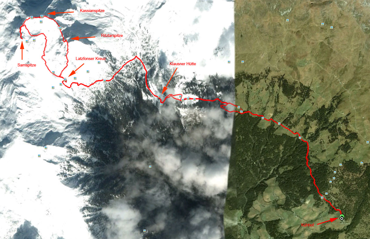Um 09:30 h beim Parkplatz Kühhof ober Latzfons los. Das Wetter ist wie in den letzten 2 Wochen: hartnäckiger Hochnebel, der knapp oberhalb unseres Startpunktes auf uns wartet. Wir hoffen, dass der Wetterbericht recht hat (Auflösung des Hochnebels ab Mittag, Obergrenze Hochnebel 2000 m - 2500 m); wir sollten also jedenfalls etwas Sonne sehen, da unsere Ziele alle oberhalb von 2500 m liegen (wenn auch teilweise knapp). Auf dem breiten und anfangs nicht steilen Wirtschaftsweg bis zur Klausner Hütte. Bis dahin auch einiger Autoverkehr. Bald nach der Klausner Hütte wird der Wirtschaftsweg steil bis sehr steil und der Nebel reduziert unsere Sicht auf 10 m - 15 m. Erst kurz vor Erreichen schält sich die Kirche Latzfonser Kreuz mit zugehörigem Schutzhaus aus dem Nebel. Am Latzfonser Kreuz hört der Wirtschaftsweg auf und der Steig beginnt. Eigentlich wollten wir über die Ritzlarspitze zur Kassianspitze und weiter zur Samspitze, infolge des Nebels beschließen wir aber die Runde in umgekehrter Reihenfolge zu absolvieren, da der Weg dabei einfacher ist. Ab dem Kassiansee beginnt der Nebel dünner zu werden und wir können zwischendurch die Sonne erahnen. Beim Anstieg zur Samspitze sind wir zwischendurch ober den Wolken und können gegen Norden ein Wolkenmeer mit nur wenigen Spitzen, die daraus hervorragen (wie Nunataker aus dem Eis), sehen. Der Nebel gibt jedoch nicht auf und kommt immer wieder zurück. Auf der Samspitze (in der Tobacco-Karte nur mit einer Höhenangabe versehen, ohne Gipfelbezeichnung, dafür aber in der Realität mit einem Kreuz und einer leeren Büchse für das nicht vorhandene Gipfelbuch) reisst der Nebel kurz für das obligatorische Gipfelfotoauf. Auf dem nicht markierten Steig zurück zum wenig ausgeprägten Joch und weiter auf die Kassianspitze. So wenig besucht wie die Samspitze (und die Ritzlarspitze), so überlaufen ist die Kassianspitze. Die Rast dort dient nur der Nahrungsaufnahme, auch da sich der Nebel weiterhin hartnäckig zeigt. Abstieg und Wiederaufstieg zur Ritzlarspitze ist steil und teilweise ausgesetzt (Steig nicht markiert). Nun reißt der Nebel endlich endgültig etwas auf, wenn auch ohne größere Weitsicht. Von der Ritzlarspitze geht es anfangs ebenfalls steil zum Latzfonser Kreuz. Dort treffen wir auf Burchard, Birgit, Irlande und die Mutter von Bernd, die später gestartet und bis zum Latzfonser Kreuz aufgestiegen sind. Nach einer Pfanne Paste, Kuchen und Kaffee (auf der Speisekarte gibt es am Sonntag keinen Kaiserschmarrn!!!) schlendern wir langsam talwärts. Im Abstieg ist der Wirtschaftsweg eine Wohltat für meine kaputten Knie.