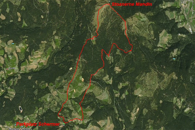 Um 9:00 h beim Parkplatz Schermoos los; bestes Wetter, warm für die Jah reszeit. Über Wiesen und Forstwege gemütlich zum Möltner Joch und weiter zur Möltner Kaser. Dort erste Rast und ein Kaffee. Bald weiter zu den Stoanernen Mandln; auf manchen Karten wird die Erhebung auch Schöneck genannt. Den umgangssprachlichen Namen "Stoanerne Mandln (=Steinerne Männchen) hat der Gipfel von der Unmenge von Steinmännern, die dort errichtet wurden. Das Gipfelpanorama wird bewundert (Dolomiten, Ötztaler, Ortler, Brenta) und die verschiedenen Gipfel benannt, der mitgebrachte Proviant wird vollständig vertilgt und Fotos geschossen. Nach längerer Rast geht es zur Jenesier-Jöchl-Alm. Auch dort längere Rast mit Kaffee und Kuchen. Zum guten Schluss so langsam zurück zum Ausgangspunkt.