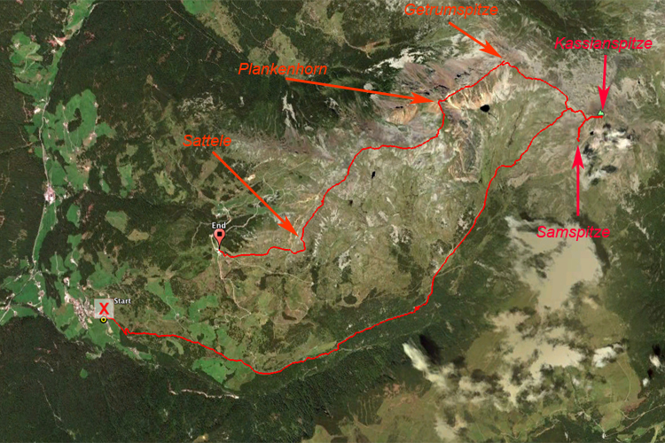 Lang (Rundtour über 16 km); Aussicht nach allen Seiten grandios; Kassianspitze und Samspitze stark begangen; Getrumspitze und Plankenhorn wenig. |