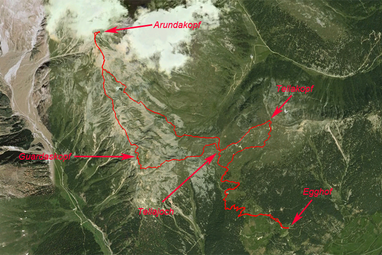 Wie im heurigen Frühsommer schon öfters, war ab Mittag eher schlechteres Wetter vorausgesagt, daher war wieder eher früher Start angesagt. Um halb acht in Meran gestartet, gehen wir um dreiviertel neunvom Egghof ober Taufers im Münstertal los. Anfangs auf steilem Wirtschaftsweg bis zur Tellaalm (dort drei Llamas auf den Wiesen) und dann auf dem Steig weiter. Auf ca. 2200 m abgezweigt und weglos zum sichtbaren Gipfelkreuz des Tellakopf; Überlegung war, den Gipfel sofort mitzunehmen, da wahrscheinlich beim Rückweg keiner von uns mehr Lust haben würde, die zusätzlichen 150 Hm vom Tellajoch zum Gipfel machen zu wollen. Kurze Rast am Gipfel und dann Abstieg zum Joch; dort ein paar Einheimische und eine Gruppe Schweizer (wahrscheinlich SAC-Tour) getroffen. Alle gehen auf den Tellakopf, während wir uns zum Guardaskopf aufmachen. Vor uns nur ein Bergsteiger, den wir bis zumGipfel überholt haben. Zeitweise wabern Nebel um den Gipfel, aber es klart immer wieder auf. Zeitweise kommt sogar die Sonne durch. Fotos und kurze Rast, gerade lang genug einen Müsliriegel zu verspeisen. Weiterweg im Nebel, so sehen wir nicht, wie weit es noch ist. Ab und Auf und wieder Ab und schlußendlich auf zum Gipfel des Arundakopfes. Anfangs noch im Nebel, der aber bald verschwindet. Ab da bis zum Auto bleibt nun das Wetter schön; fast windstil, warm und immer wieder Sonne zwischen den Wolken. Nach Norden tauchen Muntpitschen und Piz Sesvenna immer wieder aus den Wolken aus; nach Süden sticht der Piz Chavalatsch hervor. Nach einer halben Stunde brechen wir auf; zuerst die paar Schritte zum höchsten Punkt (wie auch beim Guardaskopf und vielen einigen anderen Gipfeln im Vinschgau ist das Kreuz nicht am höchsten Punkt) und dann der Abstieg. Ein Paar kommt uns entgegen. Bald nachdem Gipfel, auf ca. 2800 m, verlassen wir den markierten Steig und steigen weglos Richtung Südosten ab. Zeitweise finden wir alte Steigspuren und sogar eine Markierung. An den Plobiseen vorbei erreichen wir am Durriboden den alten Tellawaal. Entlang des zugeschütteten Waales geht es ohne Gegenanstieg ins Tellajoch. Von dort auf dem Steig zurück zum Auto.