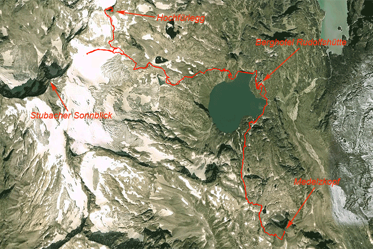 Start in Meran um 11.15 h und unterwegs zuerst Helga und Verena (in Bozen) und dann Renate (in St. Lorenzen) mitgenommen; Fahrt durch das Pustertal bis Lienz, dann nach Norden durch den Felbertauerntunnel, weiter nach Osten bis Uttendorf und zum Schluss 17 km nach Süden bis zum Enzingerboden (Talstation Seilbahn); Auffahrt zum Weißsee und dann durch den Tunnel die letzten paar Meter zum Berghotel Rudolfshütte. Die Rudolfshütte war ursprünglich als luxuriöses Ausbildungszentrum des DAV gebaut und betrieben; nachdem aber die Seilbahn ihren Betrieb eingestellt hatte, war das Ausbildungszentrum für den DAV nicht mehr ohne dauernde Verluste zu betreiben und wurde an einen Hotelier verkauft. Dieser nahm auch die Seilbahn und das Schigebiet wieder in Betrieb und führt die Rudolfshütte seitdem als Dreisternehotel. Helga, Verena, Renate, Norbert und ich wollten wieder einmal ein Wochenende in den Bergen verbringen und reisten daher trotz des unsicheren Wetters (schlechte Wettervorhersage) an in der Hoffnung jedenfalls irgendetwas machen zu können. Geplant war die Hohe Riffl und der Stubacher Sonnblick. Schlußendlich wurden es dann wegen des Wetters die Hochfürlegg und der Medelzkopf.