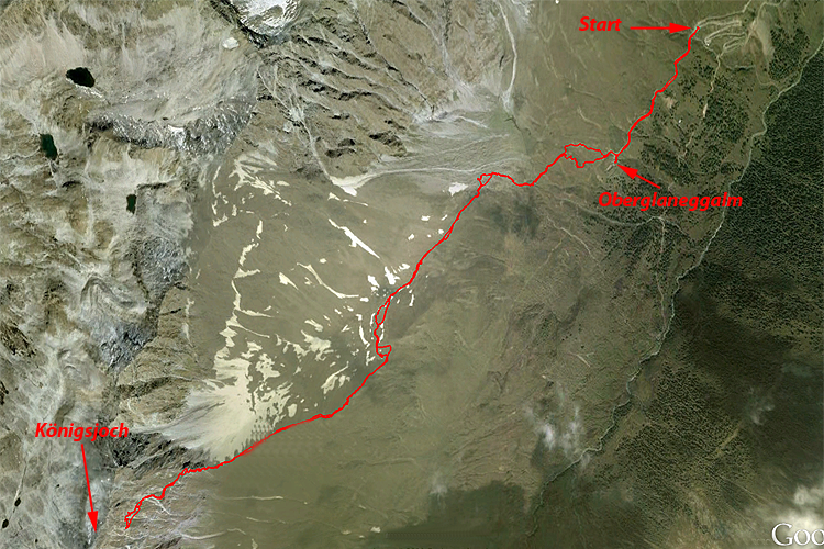 Da Verena erst ihre Kinder bei den Schwiegereltern in Kuens abgeben musste, sind wir relativ spät (08:30 h)in Riffian gestartet. Um 09:40 h beim Parkplatz in der Kurve los (ein paar Deutsche, die mit 40 - 50 km/h vor uns her geschlichen sind, haben uns ziemlich aufgehalten). Nach ein paar Minuten sindwir bei der Oberglaneggalm; dort geht der Steig rechts ab. Anfangs steil, dann etwas gemütlicher geht es den Berg schräg (südwestlich) hinan. Bald wieder steiler zum Schaferegg, über dessen Rücken der Steig in den Felsen führt. Ein paar Seile helfen über die steilsten Stellen hinweg. Der Steig quert nun ansteigend die steilen Grasflanken. An und für sich nichts tragisches, aber nun verschwindet der Steig im Schnee; mal tiefer, mal flacher spuren wir weiter ansteigend die Flanke. Ein Ausrutschen würde dazu führen, dass man sich ein paar hundert Meter tiefer unten wieder findet. Einmal verlieren wir den richtigen Weg und müssen über nasses Gras sehr steil einige Meter wie auf Eiern absteigen. In der Zwischenzeit hat uns auch Nebel eingehüllt; wir gehen noch ein Stück weiter, aber die Situation und Sicht wird nicht besser, so beschließen wir umzukehren, obwohl wir laut GPS nur 50 Hm unter dem Joch sind. Better safe then sorry. Die schneebedeckten Flanken sind im Abstieg noch unguter, aber langsam kommen wir tiefer und verlassen endlich den Schnee. Am Rücken des Schaferegges finden wir eine windgeschützte Stelle und rasten. Unterhalb der Nebel kommt auch die Sonne wieder durch und es wird angenehm warm. Bald steigen wir weiter gemütlich ab und genehmigen uns auf der Oberglaneggalm ein Bier bzw. eine Gerstsuppe. Nach insgesamt 4 Stunden (+ Rast) sind wir wieder beim Auto.