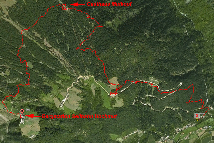 Meine erste Wanderung nach der Achillessehnenoperation. Habe lange geschlafen und bin erst um 12:15 h knapp unter dem Tiroler Kreuz gestartet. Gehe gleichmäßig bis zum Eggbauer (untere Muthöfe). Dort ruft mich Bernd an; erst ist schon viel früher gestartet und bereits im Abstieg vom Gipfel der Mut. Da ich bishierher keine Probleme hatte, vereinbaren wir, dass ich bis zum Mutko pf weitergehe und er dort auf mich wartet. Ich gehe weiter und bin nach insgesamt 2 Stunden beim Gasthaus am Mutkopf.Treffe dort wie vereinbart Bernd. Nach längerer Rast und ein paar alkoholfreien Hefe steigen wir langsam bis zum Hochmuter ab. Dort brauchen wir nicht lange auf die Seilbahn warten und sind dann bald wieder bei den Autos.