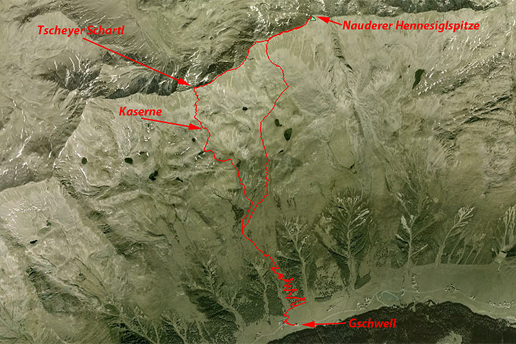 Letzer 3000er in diesem Jahr; jetzt definitiv, da es seit Sonntag in dieser Gegend doch einiges geschneit hat. Um 07:00 h in Meran und um 08:40 h in Gschwell in Langtaufers gestartet. Vorher noch einen Kaffee getrunken; konnten das Auto auf dem Parkplatz des Gasthauses stehen lassen. Die ersten paar Meter auf dem neuen Viehtrieb- und Traktorweg, den das Forstamt Schlanders beim Bauen ist. Weiss nicht wohin und Zweck entgeht mir. Bald startet der alte Militärweg, der in angenehmer Steigung (geeignet für Mulis mit Kanonen auf dem Rücken) und vielen Kehren durch den Lärchenwald nach oben führt. Etwas Gutes, das das Militär hinterlassen hat. Sobald wir den Wald hinter uns haben und der Weg durchs Moosige Loch führt, liegt der am Samstag gefallene Schnee (ein paar Millimeter). Dort wo ein Bach den Weg quert, ist er auf mehreren Metern komplett vereist. Wir kommen recht schnell weiter und erreichen bald die Kaserne am Langtauferer Höhenweg. Ab da müssen wir uns den Weg suchen, da er nicht mehr ausgeprägt ist und unter dem Schnee nicht offensichtlich ist. Kurz vor dem Tscheyer Schartl finden wir wieder ein paar Steigspuren und erreichen bald das Schartl mit dem gelben Metallschild österreichischer Prägung. In der Nordseite liegt einiger Schnee und am Kamm selbst auch immer wieder einiger Schnee, der nur an der Südkante einigermaßen tragfähig ist. Etwas mehr Aufmerksamkeit braucht es aber in den felsigen Passagen bald nach dem Schartl, da die millimeterdünne Neuschneeauflage den Stein ziemlich rutschig macht. Wir kämpfen uns vorsichtig weiter, weichen einmal auch in die Nordseite aus und überschreiten eine Graterhebung (2968 m), ab der es etwas besser wird. Nach insgesamt 3 3/4 Stunden erreichen wir den Gipfel mit dem relativ neuen Kreuz, das das letzte Mal, als ich vor ein paar Jahren dort war, noch nicht vorhanden war. Bis zum Schartl waren wir recht schnell (mehr als 400 Hm/h), aber der Grat bzw. Rücken hat uns etwas eingebremst. Wir halten uns nur kurz am Gipfel auf (ein paar Fotos) und starten wieder zum Abstieg. Die Idee, den Gipfel zu überschreiten und über die Radurschelscharte abzusteigen, lassen wir fallen. Sobald wir die Senke zwischen dem Gipfel und der nächsten Erhebung erreicht haben, entscheiden wir weglos abzusteigen, da der Neuschnee inzwischen geschmolzen ist und das ganze nicht mehr so rutschig erscheint. Vorher suchen wir uns aber ein windgeschützes Plätzchen und holen die ausgefallene Gipfelrast nach. Die Zeit drängt nicht mehr so. Nach einer 3/4 Stunde starten wir und steigen langsam und vorsichtig durch den Matscher Winkel zu den Pratzner Schwemmseen ab. Dort erreichen wir einen weiteren alten Militärsteig, der unmarkiert talwärts führt. Aus der Karte ist ersichtlich, dass er später auf unseren Aufstiegsweg stossen wird; wir queren aber bereits etwas früher zum Aufstiegsweg. Immer den Nebel über den Tälern (Langtauferer Tal und Vinschgau) im Blick trödeln wir langsam talwärts. Auf ca. 2300 m tauchen wir in den Nebel ein und verabschieden uns von der Sonne. Gegen viertel nach Vier erreichen wir das Auto und gönnen uns noch einen heißen Kräutertee im Gasthaus bevor es nach Hause geht.