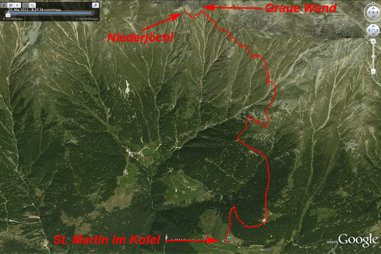 Da ab der Mittagszeit Gewitter und Regen vorhergesagt war, wurde relativ früh gestartet. Um knapp nach8:00 h mit der Seilbahn nach St. Martin im Kofel. Anfangs auf Forstweg, dann auf Steig 6 durch den lichten Wald. Anfangs sonnig, aber einige Gipfel in der Umgebung bereits in Wolken gehüllt. Teilweise recht steil, nach der Waldgrenze weniger steil durch die steilen Südhänge (Goldrainer Alpe). Gipfel nun immer mehr in Wolken gehüllt, ebenso wie Sonne. Mit kleinen Zwischenabstiegen geht es stetig Richtung Kamm. Ein paar Meter unter der Scharte ist eine Nothütte, in der jemand übernachtet hat (T-Shirt,Schlafsack, Schuhe zum Trocknen ausgelegt bzw. gehängt). Am Kreuz, das den höchsten Punkt markiert, schnell ein paar Fotos gemacht, dann sofort wieder umgekehrt, da Norbert, der in Laufschuhen unterwegs ist, Sorge hat, dass der in Aussicht gestellte Regen, den Steig zur Rutschbahn machen würde. Eigentlich war geplant gewesen, die paar Meter weglos auf die Graue Wand aufzusteigen, um einen Gipfel abhaken zu können, aber die drohenden Wolken haben uns davon absehen lassen. Beim Abstieg graupelt es anfangs ein bißchen, hört aber bald auf. Bei einer Almhütte knapp oberhalb der Waldgrenze wird dann gerastet und das mitgebrachte Essen verzehrt, bevor das letzte Stück in Angriff genommen wird. Um 14:00 h wieder in St. Martin im Kofel. Wir nehmen nicht die nächste Bahn, sondern setzen uns noch ins Gasthaus und essen eine Kleinigkeit. Erst gegen 15:00 h geht's dann mit der Bahn nach Latsch. Dort genießen wir noch ein Eis. Das angesagte Gewitter hat es dann doch nicht gegeben.