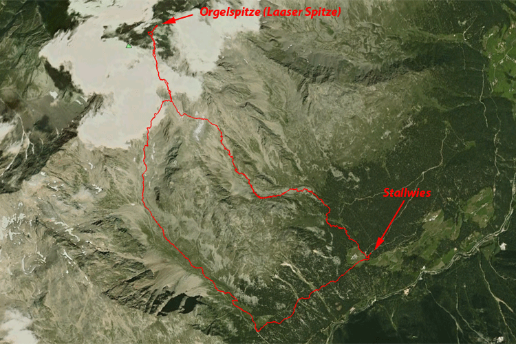 Zwar recht früh in Meran los (6:45 h, für Karins Standard etwas spät), aber da wir verschiedene Teilnehmer aufsammeln mussten und in 2 Autos unterwegs waren, starten wir erst kurz vor 8:00 h bei Stallwies. Anfangs ein paar Meter auf einer für mich neuen Forststrasse, dann aber bald auf einem Steig weiter. Sofort steil los und es bleibt gleichmäßig steil, höchstens zwischendurch steiler. :-). Wir werden überholt und überholen. Wie zu erwarten war, recht ordentlich begangen. Ich gehe gleichmäßig durch ohne zu rasten; die anderen bleiben zwischendurch kurz stehen. Gentleman Bernd bleibt natürlich bei den Damen; bei meiner bescheidenen Kondition würde mich das Stop-and-go zu sehr ermüden. Auf ca. 3000 m ab dem Steinmanngasseloch für kurze Zeit flacher, fast eben, dann geht's den Gipfelhang hinauf. Zwar immer gut markiert, aber viele verschiedene Steigspuren und die besten verschwinden nach kurzer Zeit. Nach knapp dreieinhalb Stunden bin ich am Gipfel, die anderen folgen etwas später. Der Wind bläst ziemlich am Gipfel und als die Sonne dann zeitweise hinter den Wolken verschwindet, ist die winddichte Fleecejacke recht nützlich. Die Gruppe von Frauen, die wir im Aufstieg überholt haben, erreicht auch bald den Gipfel. Eine Frau hat einen Anfall von Schwindel und steigt gleich wieder mit anderen ab. Wir bleiben über eine Stunde am Gipfel, bevor wir uns an den Abstieg machen. Wir entscheiden uns, über das Schludertal abzusteigen. Vor Jahren war im Schludertal ein Pärchen Bartgeier ausgewildert worden und waren dort bei ihrem Nest in der Lorchenwand zu beobachten. Diesmal haben wir aber keine Bartgeier gesehen. Der Abstieg durch das Schludertal ist angenehmer als der Aufstieg, auch wenn ab der Schluderalm ein paar kurze Gegenanstiege zu bewältigen sind. Im windgeschützten Schludertal und dann noch mehr bei der Querung zurück zu Stallwies wird es wieder richtig heiß und schwül. Dafür schmeckt uns dann das Getränk auf Stallwies umso besser. Wetter, wie gesagt, am Gipfel windig, zeitweise versteckt sich die Sonne in Wolken; alles in allem aber ein toller Gipfeltag.
