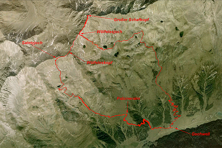 Um halb acht in Meran los; in Langtaufers lang und breit nach einer offenen Bar für einen Kaffee gesucht, daher schlussendlich erst um 20 vor 10 h los. Zuerst von Gschwell, wo wir bei dem geschlossenen Gasthaus geparkt haben, über gemähte Wiesen schräg Richtung Waldrand und dann zum Patziner Bach. Diesen überquert und auf dem Steig Nr. 16 (laut Karte, ansonsten Nr. 9 in der Wirklichkeit) zur Patziner Alm. Von dort links bis zu der verfallenen Kaserne und weiter zum Saletzjoch. Am Joch den ersten Schnee getroffen; gleichzeitig frischt der Wind, der schon die ganze Zeit geblasenhat, fast zu Orkanstärke auf. Durch den Wind auch sehr kalt. Wir kämpfen uns über den Wölfeleskopf drüber, steigen ins Wölfelesjoch ab und weiter zum Großen Schafkopf, den wir nach 4 Stunden und 5 Minuten erreichen.. Auf der Nordseite, wo wir im Windschatten sind, ist es fast angenehm warm, da auch zwischendurch etwas Sonne durchscheint. Am Kamm und an der Südseite bläst aber der Orkan. Am Gipfel gibt es nur schnell ein paar Fotos, nicht mal ein Gipfelbussl, und schon steigen wir wieder ab. Ab Wölfelesjoch folgen wir Steigspuren und einer alten Markierung, die aber ein Stück vor dem Gschweller Sees auf nimmer wiedersehen verschwindet. Weglos geht es problemlos bis zum Höhenweg und auf diesem nach Osten bis zur anderen Kaserne. Erst dort rasten wir und essen und trinken. Inzwischen hat aber der Himmel weiter zugezogen und es sieht Richtung Tal aus eher dunkel aus, daher gehen wir bald weiter. Über den schönen Weg Nr. 8 geht es gemütlich Richtung Gschwell. Der Weg selbst ist zwar schön (an ein paar Stellen brechen die alten Trockenmauern etwas weg, schade, dass sich anscheinend niemand für die Instandhaltung zuständig fühlt), aber komplett mit Kuh- und Pferdescheiße zugeschissen. Das erste Mal, dass ich den Weg in einem solchen Zustand sehe, obwohl ich ihn bereits öfter auch um diese Jahreszeit gemacht habe. Nach 7 Stunden 20 Minuten sind wir wieder am Auto. Auf dem Heimweg fängt es auch leicht zu regnen an.