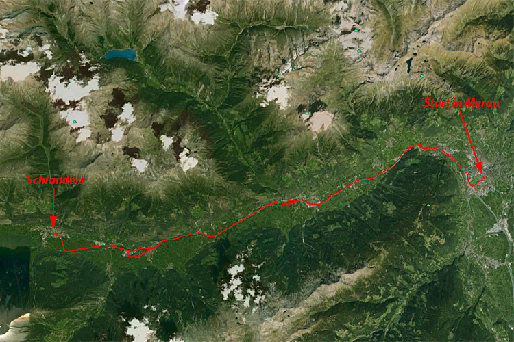 Bernd ko mmt um 10:30 h zu mir und dann starten wir auf dem Radweg zum Untermaiser Bahnhof und von dort immer auf dem Radweg entlang der Etsch, dann über die Töll (einzige nennenswerte Steigung bis Schlanders) und weiter nach Naturns. Hinter Naturns auf dem neuen Radweg bis Latsch. Nach Latsch ein Stück auf der Straße bevor wieder auf dem neuen Radwegstück bis Schlanders. Früher ging es unter den Berg und dort in leichtem Auf und Ab bis zum Holzbruggweg, der dann nach Schlanders hinführt. Jetzt führt der Radweg im Talboden hauptsächlich ent lang der Etsch flach auch zum Holzbruggweg, aber näher beim Ort.