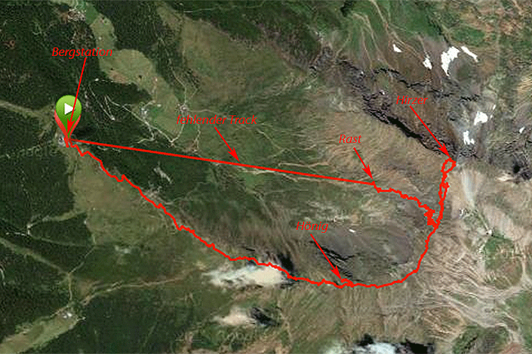 Eli konnte am Samstag nicht und Sonntag war für Pappi reserviert, also habe ich mich Bernd anges chlossen, der bereits mit Karin und Claudia ausgemacht hatte, auf den Hirzer zu gehen. Ich war zwar schon einige Male auf dem Gipfel, auch von Sarntal aus, aber noch nie auf dem Hönig. Am Morgen wurde die erste Bahn um halb neun genommen und so sind wir von der Bergstation um ca. 10 vor neun los gegangen. Zuerst war Bernd voraus und ich als letzter, aber da Claudia nicht den besten Tag erwischt hatte und relativ langsam unterwegs war, habe ich sie und Ka rin bald überholt. Bernd hat dann immer wieder auf sie gewartet und so bin ich langsam und stetig vorausgegangen. Der Steig auf den Hönig ist zwar markiert, aber vor allem im oberen Teil passiert es immer wieder infolge von verschiedenen Steigspuren, dass man den markierten Steig verlässt. Das Gelände ist eher steil, wenn auch nicht felsig; so richtiger sarner Wasnberg. Am Hönig angekommen, habe ich ein bisschen fotografiert und gewartet, bis ich die anderen weiter unten komm en sah. Dann bin ich weiter. Über die nächsten zwei namenlosen Erhebungen bis zur Oberen Scharte, wo sich die Steige aus dem Sarntal und von der Hirzerhütte treffen. Bald darauf treffe ich einen ehemaligen Arbeitskollegen aus Institutszeiten, den ich seit meinem Weggang vor 25 Jahren nicht mehr gesehen hatte. Christoph ist mit seiner Frau aus dem Sarntal aufgestiegen und wartet auf die anderen Institutler. Der Präsident organisiert jedes Jahr eine Bergtour und diesen Samstag geht's a uf den Hirzer. Der Rest kommt aber von der Passeirer Seite. Wir ratschen ein bisschen und dann gehe ich weiter zum Gipfel. Während ich dort raste, kommen nach und nach immer mehr Institutler, die teilweise ebenfalls über den Hönig aufgestiegen sind. Ein paar wenige kenne ich noch. Auch Bernd, Karin und Claudia sind bald am Gipfel. Nach einer nicht zu ausgiebigen Rast, da immer mehr Leute am Gipfel sind und der Platz knapp wird, steigen wir wieder ab. Bei der Oberen Scharte nehmen wir dann den Steig zur Hirzer Hütte. Im Steilstück liegt an zwei, drei Stellen harter Schnee und erfordert etwas Vorsicht. Weite r unten holen wir dann die Rast nach. Beim Weitergehen vergesse ich dann das GPS wieder zu starten (daher der rote Strich im Bild unten). An der Bergstation angekommen, fährt nach 10 Minuten die nächste Bahn und so sind wir bald wieder beim Auto.