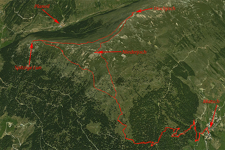 Wettervorhersage war wie in letzter Zeit üblich eher bescheiden; nachmittags sollte es besser werden. Wahl fiel daher auf eine eher kurze Tour, die sich aber nach Belieben ausbauen lässt: Spitzige Lun und zurü ck übers Niederjoch, falls Wetter hält auch bis zum Hochjoch. Um acht in Meran los und nach dem üblichen Morgenkaffe in Matsch um halb zehn los. Vor uns sind bereits zwei Gruppen gestartet. Die erste Zweiergruppe überholen wir bei der Abzweigung vom Forstweg. Wir folgen dem Steig Nr. 13 und als wir die Baumgrenze erreichen, erinnern uns an unsere geplante Biwaknacht hier an einem Vorabend von Allerheiligen vor ca. 15 Jahren. Wir haben damals hier in unseren Schla f- und Biwaksäcken übernachtet. Bernd ist in der Nacht von der Matte gerutscht, hat aber durch den Nadelteppich nichts davon gemerkt. Am Morgen war alles weiß überzuckert, wir inklusive. Wir wollten damals noch eine zweite Biwaknacht anschließen, da es aber im Laufe des Tages zu schütten bega nn, sind wir nach dem Hochjoch über die Gondalam wieder zurück nach Matsch. Sauwetter, aber erinnerungswürdig. Heute regnet es nicht, obwohl der Himmel wolkenverhangen ist und die Nebel tief hängen. Nach kanpp zwei Stunden sind wir auf der Spitzigen Lun und treffen hier die andere Gruppe. Während diese weiter rastet, gehen wir sofort weiter Richtung Hochjoch. Zeitweise gehen wir im Nebel; dieser reißt aber immer wieder mal auf und zwischendurch scheint dann sogar die Sonne. Nach einer weiteren Stunde sind wir am Hoc hjoch. Knapp unterhalb des Gipfels in einer windgeschützten Mulde rasten wir. Essen, trinken, ratschen, fotographieren. Auf den Nordseiten liegt noch einiger Schnee, während die Südseiten ziemlich frei sind. Als wir zum Abstieg starten, kommen von Norden her die beiden, die wir am Anfang überholt hatten. Sind wahrscheinlich über die Gondaalm aufges tiegen. In gerader Linie geht es zum Niederjoch; dieses ist dann wieder vom Nebel eingehüllt. Dieser bleibt uns treu bis auf ca. 2100 m. Ab da wird es dann freundlich und sonnig!!! Langsam geht es weiter abwärts, zuletzt wieder über die Forststrasse. Nach knapp mehr als fünf Stunden sind wir wieder beim Auto.