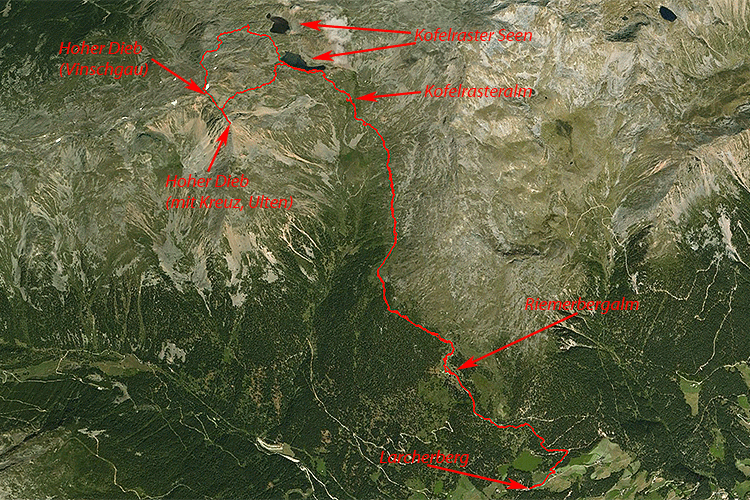 Um 07:00 h Bernd abgeholt, in St. Walburg im Cafè Ultun noch einen Kaffee getrunken und dann um halb ne un am Parkplatz am Larcherberg los. Vor uns eine Dreiergruppe (Inhaber des Geschäftes Hemden Antenhofer auf der Winterpromenade) gestartet; diese haben wir noch vor der Riemerberglalm eingeholt. Nach der Alm folgt noch ein Anstieg, dann geht es durch einen Wald traversierend mit gelegentlichem Höhenverlust Richtung Kofelrast. An der Kofelraster Alm vorbei steigt man zum Langen See. Der Steig umrundet den See am Südwestufer; zu dieser Zeit liegen kurze Teile des Steiges unter Wasser, so voll ist der See. Bald zweigt der Steig nach Südwest en zum Hohen Dieb ab. Das Gipfelkreuz war schon seit der Traversierung zu sehen; nun wird des von den Wolken eingehüllt. Es ist kalt und windig. In knapp vierzig Minuten sind wir beim Kreuz. Die letzten Meter geht es über Blockgestein und wir müssen Willi zwischendurch behilflich sein; zum Glück hat sein Geschirr einen Handgriff und so können wir ihn über die schwierigen Stellen hinweghieven. Wir halten u ns nur für ein paar Fotos im Nebel auf, dann gehen wir weiter zum Vinschger Gipfel. Diesen ziert nur ein Holzschild mit der Aufschrift "Hoher Dieb 2730 m". Wir überschreiten den Gipfel Richtung Oberen Kofelrastersee. Die Schneefelder sind ein Vergnügen für Willi; er rutsch auf dem Rücken oder streckt die Hinterbeine von sich und zieht sich mit den Vorderbeinen voran. Er hat jedenfalls eindeutig Spass daran. Am gegenüberliegenden "Hügel" (ist in der Karte namenlos) steigen ganze Horden hinauf bzw. hinunter. Ein kleiner Gegenanstieg über ein Schneefeld und ein paar Felsen (Willi braucht wieder ein bißchen Hilfe) bringt uns wi eder in Sicht des Langen Sees. Die Nebel haben sich nun etwas verzogen und auch der Hohe Dieb ist wieder frei. Am Langen See vorbei erreichen wir die Kofelraster Alm, wo wir nach gut viereinhalb Stunden erstmals rasten und etwas essen. Auch Willi bekommt etwas. Wir halten uns nicht lange auf und gehen bald weiter. Im Abstieg zieht sich die Traverse und es braucht eine Weile bis wir die Riemerberglalm erreichen. Willi sind die dort weidenden Kühe nicht ganz geheuer und er stellt ihnen in weiten Bogen aus. Über de n Wirtschaftsweg mit einigen Abkürzungen erreichen wir nach fast sechseinhalb Stunden wieder das Auto. Wir sind alle müde. Der Piz Lad letzte Woche, obwohl 300 Hm mehr und sogar 1 km länger hat uns weniger abverlangt; naja, nicht jeder Tag ist gleich. Auch Wili ist ko; nur mehr ins Auto und niederliegen. Bei der Heimfahrt stoppen wir nochmal beim Cafè Ultun; so erhält Bernd sein Handy wieder, das er am Morgen dort vergessen hatte, Eli einen Kaffee und ich ein alkoholfreies Hefe.