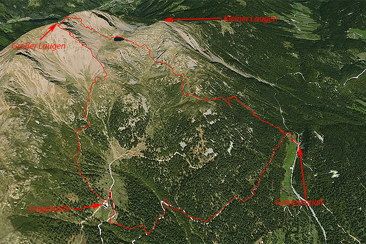 Ich mu ss um 14:00 h wieder zu Hause sein, daher habe ich nach einer kurzen Tour mit kurzer Anfahrt gesucht. Habe zuerst die Schröfwand in Schnals ober Vernagt ins Auge gefasst (war zum ersten und letzten Mal vor über 20 Jahren dort oben), dann aber fallen gelassen, da entweder unchristlich früh aufstehen oder s onst zu lang. Bin dann wieder beim Laugen gelandet; zum x-tan Mal. Um kurz nach acht (8:11 h um genau zu sein) am Gampenpaß gestartet. Knapp vor mir ein Bergläufer los und eine andere Wanderin. Bald nach dem Start, schon im steilen Wald kommen mir zweimal andere Bergwa nderer schon im Abstieg entgegen; ein weiterer Bergläufer überholt mich. Ich bin selbst nicht ganz langsam unterwegs; das Wetter ist zwar anfangs im Wald eher schwül, ober der Waldgrenze aber dann eher frisch und fein zum Gehen. Weiter oben, knapp unter dem Gipfel sehe ich weitere Wanderer. Bald bin ich auch am Gipfel; für mich in neuer Reko rdzeit (eine Stunde 40 Minuten); treffe die Wandererin wieder. Andere Wanderer und Bergläufer kommen in den 20 Minuten, die am Gipfel raste und esse, an und verlassen den Gipfel wied er. Ich steige über den Steig 10, der wie eine Autobahn ausgebaut ist (Geländer, Treppen etc.) ab und bin nach 50 Minuten bei der Laugenalm. Immer wieder habe ich andere Wanderer gekreuzt. Gehe weiter und bin nach insgesamt einer Stunde und 20 Minuten beim Auto. Es fallen einige Tropfen. Weitere Wanderer starten gerade. Wie man sieht ein mehr als beliebter Berg (es ist Samstagvormittag!!).