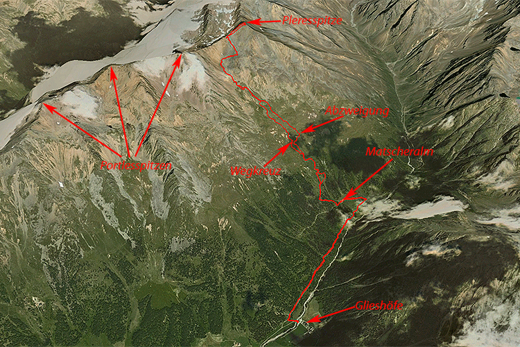 Wir sind dann um knapp vor halb neun bei den Glieshöfen gestartet; zuerst über die Almstrasse zur Matscher Alm. Dort gab's dann einen Wegweiser zur Oberetteshütte (etwas verwunderlich, da auf der falschen Talseite); bald darauf nochmal, diesmal mit dem handschriftlichen Zusatz "Umweg". Wir sind dem Steig und der Markierung (7/7a) gefolgt, bis wir laut Karte weglos abgezweigt sind. Bald darauf ist der Steig von rechts her wieder aufgetaucht, hat nur eine Schleife gemacht. Auf einem Rücken dann wieder Wegzeichen; da auch auf diesen nur die Oberettesh ütte angeschlagen war, sind wir wieder weglos Richtung Spitze abgezweigt. Abermals finden wir ca. 1/2 Stunde später wieder Markierungen und zwischendurch Steigspuren. Da diese in die richtige Richtung führen, folgen wir diesen. Schön markiert geht es jetzt bis zum Gipfel. Einige der Markierungen sind älter, andere neuer. Am Gifpel, den wir nach ca. 3 1/2 Stunden erreichen, Am Gipfel befindet sich ein kleines Kreuz, an dem die Schachtel mit dem Gipfelbuch befestigt ist. Vom Gipfelbuch hat der Autor geschrieben, von den Markierungen nichts, auch im letzten Bereich ist der Autor anscheinend anders gegangen. Stellt sich schon die Frage, was solche Führerautoren schreiben. Im unteren Bereich hat der Autor genau die Ansteigsroute laut Markierungen beschrieben, im Gip felbereich ist er abgewichen. Die Markierungen waren sicher schon vorhanden. Naja, wie schon früher mal erwähnt, hat auch Tabacco schon Wege in den Karten eingezeichnet, die es in der Wirklichkeit nicht gab und umgekehrt. Warum soll also ein Autor sowas nicht auch machen; es ist ja beste Führerliteraturtradition Anstiege zu beschreiben, die man möglicherweise selbst gar nicht gemacht hat. Am Gipfel befinden sich auch Pickel und Schaufel, laut Gipfelbucheintrag waren gestern zwei Bergsteiger hier, um das Loch für das neue Kreuz vorzubereiten. Wie wir später auf der Alm erfahren, soll in einer Woche das neue Kreuz aufgestellt und mit Gipfelmesse eingeweiht werden. Heute sind wir jedenfalls alleine am Gipfel und am Berg. Ursprünglich hatten wir auch so eine halbe Idee den Kamm bis zur Inneren Portlesspitze zu begehen, sehen jetzt aber davon ab. Ein ige Stellen schauen etwas haarig aus (wenn ich auch im Gipfelbuch der Äußeren Portlesspitze einmal gelesen habe, dass jemand von der Pleresspitze kommend alle drei Portlesspitzen überschritten hat; es gibt bessere Bergsteiger als mich). Nach ausgiebiger Rast (fast eine Stunde) machen wir uns langsam auf den Rückweg. Diesmal folgen wir den Markierungen aufmerksam und stellen fest, dass diese im Bereich vor dem Zusammentreffen mit dem Steig zur Oberetteshütte (Umweg :-)) ziemlich rar wurden. Die Abzweigung selbst findet man vom Steig zur Oberetteshütte aus kaum; man muss schon genau wissen wo (ca. 20 m nach dem letzten Wegweiser) oder sich immer wieder umdrehen, da nur dann der flache Stein mit der Aufschrift "Pleres" sichtbar ist. Auf der Matscheralm ma chen wir dann Rast und lassen uns ein Hefe schmecken. Von der Bedienung erfahren wir auch, dass der Weg auf die Valwellspitze (über die Gabelzspitze) seit einiger Zeit auch markiert ist. Die Abzweigung befindet sich immer auf dem Steig zur Oberetteshütte auf ca. 2425 m beim sog. Semmler Stein. Bald sind wir dann wieder beim Auto..