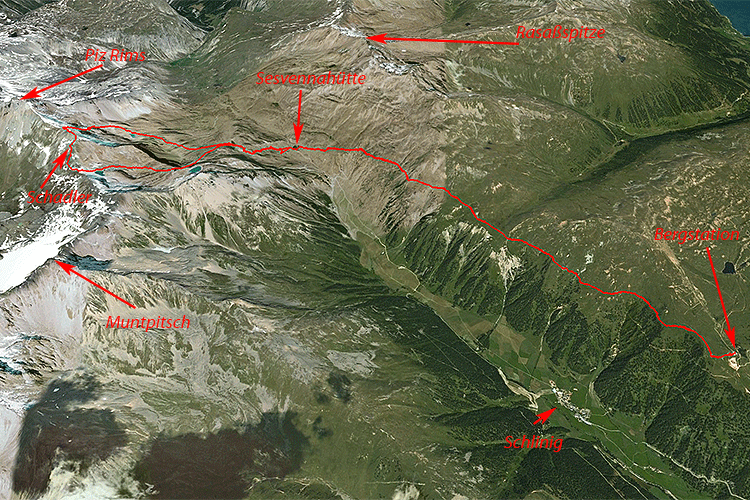 Wir hatten Großes vor. Es sollte über den Schadler den Kamm entlang zum Piz Rims, weiter zum Piz Cristanas und schlußendlich zum Piz d'Immez gehen. Von letzterem weglos zu den Lai da Rims und dann zurück über die Sesvennahütte. Bernd hatte die Idee mit dem Sessellift von Prämajur aufzufahren un d so Höhe zu sparen; dafür wären dann insgesamt 6 km mehr zu machen, aber ein etwas späterer Start drin. Gesagt, getan. Am Sonntag morgen sind wir pünktlich in Prämajur und müssen sogar noch etwas warten, bevor wir auffahren können. In der Plantapatschhütte gibt es noch einen Kaffee und dann los. Nach 1 1/3 Stunden und 6 km sind wir bei der Sesvennahütte. Das Wetter scheint immer noch so wolkenlos wie am Start. Hinter der Hütte gehtes aufwärts; Bernd zieht bald einmal voraus, dann kommt Eli und ich mache das Schlußlicht, damit niemand ve rloren geht. An der Abzweigung zum Föllakopf und dem Sesvennasee vorbei, immer aufwärts. Am Joch wartet Bernd auf uns. Aus der Schweiz kommend sind die ersten Wolken am Himmel zu sehen; auch noch eher schwarze. Bald sind wir auf dem Schadler; kurz verschnaufen und ein Gipfelfoto schießen. Die Wolken sind mehr und dunkler geworden. Weit hinten sieht man auch Regen. Ich zweifle innerlich, ob wir unsere Ziele alle erreichen werden und rechne eher damit, nach de m Piz Cristanas abzubrechen und zurück zu gehen. Als wir in der Senke zwischen Schadler und Piz Rims sind, ist der erste Regen schon da. Wir können gerade noch unsere Jacken anziehen und dann kauern wir etwas unter dem Rücken zusammen. Wir gehen nicht weiter, da wir auch Donner hören, wenn auch keine Blitze sehen. Nach einer halben Stunde ist der Spuk vorbei, es wird heller und der Regen hat fast aufgehört. Richtung Sesvennahütte hängt die abziehende Regenwand und über dem Piz Rims ist schon blauer Himmel zu sehen. Wir beschließ en weiterzugehen. Kaum auf dem Rücken und ein paar Schritte zurückgelegt, schlägt praktisch aus heiterem Himmel ein Blitz ein paar hundert Meter entfernt in den Talboden des Val Sesvenna auf Schweizer Seite ein. Das reicht. Wie der Blitz (naja) steigen wir weglos Richtung Gamspleis ab und versuchen so schnell wie möglich uns vom Kamm zu entfernen. Restliche Gipfel ersatzlos gestrichen. Der wieder eingesetzte Regen lässt bald wieder nach und im Christannesboden besc hließen wir erstmals zu rasten und etwas zu essen. Die Gewitterfront ist weitergezogen und wütet nun über der Rasaßspitze. Der Himmel über dem Piz Rims ist wieder blau, aber wir verzichten auf einen Wiederaufstieg, sondern gehen weiter zur Sesvennahütte. Nocheinmal regnet es kurz. Auf der Hütte legen wir nochmals eine Rast ein, bevor wir dann den Höhenweg zur Bergstation zurückgehen. Zurück brauchen wir 10 Minuten länger als am Morgen. Rückblickend gesehen hätten wir die letzte Talfahrt nie und nimmer erwischt, wenn wir die gesamte Tour wie geplant absolviert hätten.