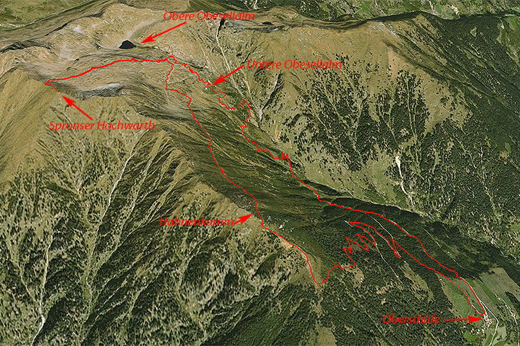Wetter sollte sich nachmittag verschlechtern, so haben wir einen Gipfel gewählt, der relativ nahe liegt. Jeder von uns war schon mehrmals auf der Spronser Hochwarth (eine von vielen: Naturnser, Ultner, Sarner/Passeirer und eben Spronser Hochwarth). Da wir auf dem üblichen Anstiegsweg über die Obesellalmen Schnee erwarten (Nordseite), nehmen wir die Schneeschuhe mit. Um acht starten wir in Meran und erreichen nach vielen Kurven den Parkplatz vor den Öbersthöfen. Wir trinken noch einen Kaffe beim Unteröberst, bevor wir dann kurz vor neun starten. Das Wetter ist schön, die Luft frisch und wir kommen gut weiter. Bald nach der Abzweigung vom Forstweg müssen wir aufpassen, dass uns nicht die ganzen Geißen nachrennen. Bernd ist dann bald voraus und kurz vor der Unteren Obesellalm überholt mich ein anderer Berggeher in kurzen Hosen und mit TSL-Schneeschuhen am Rucksack. Ab der Obesellalm versuche ich dem Sommerweg zu folgen; von Bernd und dem anderen ist keine Spur (real, im Schnee, und im übertragenen Sinne) zu sehen. Ich kann den immer mehr und größer werdenden Schneeflecken größtenteils ausstellen und am Rande umgehen. Kurz bevor sich das Gelände zurückneigt, kommt mir Bernd von links herauf entgegen. Er ist weit nach Westen ausgewichen und musste dann die Schneeschuhe anlegen. Da die Schneedecke ab jetzt geschlossen ist (auf ca. 2100 m), kommen die Schneeschuhe auch bei mir vom Rucksack an die Beine. Wir gehen nicht zur Oberen Obesellalm, die nun sichtbar wird, sondern folgen den Spuren des anderen Berggehers und schneiden direkt Richtung tiefstem Punkt zwischen Hochwarth und Spitzhorn. Der Schnee trägt gut und bald sind wir auf dem Rücken zum Gipfel und am Gipfel. Der andere Berggeher ist sofort wieder ein Stück abgestiegen und rastet auf einem Stein der aus dem Schnee ragt. Wir bleiben am Gipfel und finden auf der Südwestseite einen schönen schneefreien Rastplatz. Ein Platz an der Sonne. Mit Rast, essen und ein bißchen ratschen vergeht die Zeit und wir starten erst nach mehr als einer Stunde zum Abstieg. Angenehmund recht rasch geht es über den Schnee abwärts. Wo wir uns beim Aufstieg getroffen haben, beschließen wir nun über den Lustigen-Kameraden-Steig Richtung Hahnenkamm zu queren. Anfangs versuchen wir auf der Linie des oberen Steiges im Schnee zu queren, aber das brechen wir bald ab. Der Schnee weicht in der Sonne auf und einige Hänge sind recht steil und weisen am oberen Rand auch schon Schneemäuler auf. Wir steigen gerade ab und gehen auf dem unteren Steig weiter; dieser ist nur mehr in einigen Rinnen schneeverschüttet. Wir kommen unterm Hahnenkamm bei der neuen Schafstallhütte auf den Rücken. Eine kleine Rast und dann steigen wir gemütlich weiter ab. In angenehmen Serpentinen auf einem alten Teppich aus Lärchennadeln geht es sich einfach gut. Ein Stück auf dem Forstweg und dann auf dem alten Weg und schon sind wir wieder beim Auto. Ein paar alkoholfreie Hefe beim Unteröberst runden den Tag ab. In der Zwischenzeit haben sich dunkle Wolken am Himmel breit gemacht, aber das stört uns nicht mehr.