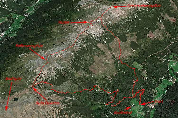 *** 13,65 km, nette Tour, zentral gelegen, daher Aussicht auf alle Sarner Berge rundum, Abstieg vom Tiefpunkt zwischen Gentersbergspitz und Hurler weglos, Latschen, im Wald dann alter Steig/Traktorweg |