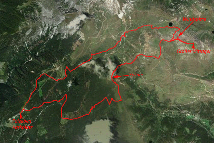 Erstens kommt es anders, zweitens als man denkt. Wir hatten ursprünglich vorgesehen um sieben von Meran aus ins Sarntal zu starten und dort auf die Leiter- und weiter die Ra delspitze zu gehen. Um 6 hat mich dann Bernd angerufen, dass es regnet und wir haben ausgemacht, es um halb acht nochmal zu versuchen, dann eventuell auf den Laugen. Bernd hat dann aber ein sms geschickt und alles abgesagt. So haben wir dann bis dreiviertel zehn geschlafen. Eigentlich wollten Eli und ich dann nur eine kleine Runde über den Spieler machen. Ich habe daher auch nur meine Laufschuhe genommen und wir haben auch nur jeder einen Liter Wasser mitgenommen. Um zwölf sind w ir dann in Falzeben gestartet. Der Himmel war voller schwarzer Wolken und es war angenehm frisch. Über die Moschwaldalm und die Maiser Alm ging es zum Kreuzjoch. Immer wieder kamen uns Wanderer entgegen. Zwischendurch haben wir auch ein paar Tropfen abgekriegt. Vom Kreuzjoch geht es dann bald weglos zum Spieler. Dort sind wir alleine. Die alte Sitzbank ist verschwunden. Die Nebel sind inzwischen gestiegen und zwischendurch gab es auch einen Sonnenstrahl. Wir haben dann beschlossen noch zur Mittagerhütte aufzu steigen. Vom Unteren Joch bis zum Oberen Joch weglos. Wille hat ohne Leine seine weiten Runden gedreht, wären wir steil aufstiegen. Ab Oberem Joch gab's dann wieder einen Steig. Kurz hüllen uns die Nebel ein, um dann wieder zu verschwinden. Von der Mittagerhütte sehen Windspitze und Großer Mittager sehr nach aus. Wir wandern weiter über die Windspitze bis zum Gipfel des Großen Mittagers. Unglaublich, aber es ist das erste Mal, dass ich auf dem Großen Mittager stehe. Vor fünfzig Jahren habe ich am Mittager Schi gefahren, bin aber nie bis zum Großen Mittager gekommen, auch später nie. Wi r steigen vom Gipfel zurück zur Abzweigung des Steiges zur Kesselberghütte ab und marenden dort auf der Bank. Nach ausgiebiger Rast queren wir auf dem Steig durch den Nordhang und über ein paar weiche Schneefelder bis zur Kesselberghütte. Von dort geht es auf dem Wirtschaftsweg zur Kirchsteigeralm. Dort gönnen wir uns etwas zum Trinken bevor wir an Rotwand- und Zuegghütte vorb ei nach Falzeben zurück wandern. Alles in allem waren wir 6 Stunden in Bewegung, die Rast nicht mitgerechnet. Zum Glück sind die Tage jetzt länger, da es bereits dreiviertel sieben war, als wir am Auto ankamen.