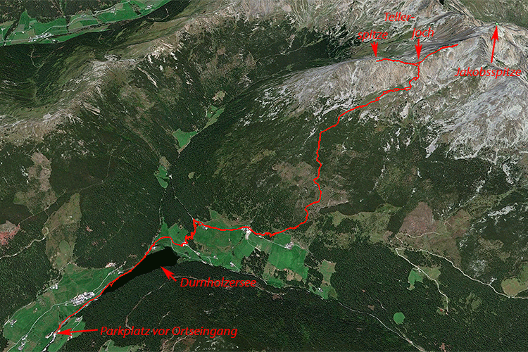 Um kurz vor neun sind wir vom Parkplatz vor dem Dorf gestartet; um diese Jahreszeit hätten wir wahrsche inlich auch bis zum Fischwirt fahren und dort parken können, aber wir haben uns an das Verbotsschild gehalten. Also auf der Teerstraße um den halben See, dann am Seeberhof vorbei und steil durch den Wald aufwärts. Auf einer weiteren Hofzufahrt eben taleinwärts und hinter dem Bachmannhof den markierten Steig durch den Lärchenwald. Es liegt Schnee, aber er stellt noch kein Problem dar. Auf ca. 1900 m lichtet sich der Wald und der Latschengürtel beginnt. Hier liegt der Schnee knietief und ist an der Oberfläche angeharscht. Spuren ist angesagt. Der Schweiß rinnt in Strömen; bei jedem Schritt hält der Schnee einen Augenblick, bevor ich d ann einbreche. Kostet Kraft. Nach 300 Hm hat die Schinderei ein Ende. Oberhalb des Latschengürtels liegt zwar auch Schnee, aber nur in den Mulden. Die Rücken sind schneefrei und der Aufstieg zum Tellerjoch erfolgt direkt auf dem schneefreien Steig. Wir hören Tierglocken und entdecken in der Flanke der Tellerjochspitze einige Punkte, können aber nicht unterscheiden, ob es sich um Schafe oder Ziegen handelt. Ein Stück unter uns sehen wir vier Jugendliche, die unserer Aufstiegsspur gefolgt sind und nach den Tieren Ausschau halten. Bald sind wir am Tellerjoch und folgen der Markierung Richtung Jakobsspitze. Nach dem ersten Aufsch wung mü+ssen abschüssige Schneefelder gequert werden und als dann auch noch nasse Platten zu queren sind, brechen wir die Besteigung ab. Auf den Platten hat Willi einfach zu viele Probleme. Nachdem wir an der Jakobsspitze auf 100 Hm unter dem Gipfel (in Luftlinie wären es wahrscheinlich noch 200 - 300 m gewesen) umgekehrt sind, steigen wir vom Tellerjoch auf die Tellerjochspitze. Am Gipfel angekommen suchen wir einen Moment den höchsten Punkt, da er nicht eindeutig feststellbar ist, gehen wir die drei Erhebungen alle ab. Das Kreuz ist viel tiefer auf einem Vorgipfel. Kurz unterhalb des Gipfels rasten wir in einer windgeschützten Mulde und marenden. Die Ziegen (sind jetzt nahe genug dies festzustellen) ha ben uns entdeckt und nähern sich uns. Die ganze Herde schiebt sich immer näher, mit Blick auf unsere Brote. Willi fühlt sich nicht so wohl und bellt die Ziegen wie verrückt an. Dies schreckt sie soweit ab, dass sie 5-6 m Abstand halten. Sie kommen zwar nicht mehr näher, aber schauen uns beinahe in den Magen hinab, so genau verfolgen sie, wie wir essen. Wir lassen uns nicht aus der Ruhe bringen (Ausnahme Willi) und gehen erst weiter, als wir alles aufgegessen haben. Im Abstieg umgehen wir den kleinen Gegenanstieg zum Joch und queren direkt zum Aufstiegsteig. Bald haben wir den Latschengürtel erreicht, aber der Absti eg ist einfacher, auch da die vier Jugendlichen die Spur etwas ausgetreten haben. Als wir den See erreicht haben, ist die Sonne schon hinter den Bergen verschwunden, auch wenn es noch hell ist. Beim Fischerwirt gönnen wir uns Bier und Kaffee, bevor am See entlang zum Auto schlendern.