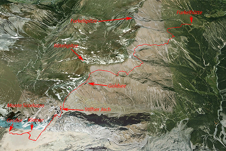 ** ca. 10,57 km bis zum Gipfel, insgesamt 12,36 km; Goldseeweg ganz nett, wird in der Gegenrichtung anscheinend auch von Mountainbikern geliebt; Monte Scorluzzo selbst ist ganz nett, aber das Stilfser Joch mit Schigebiet ist einfach zu nahe. |