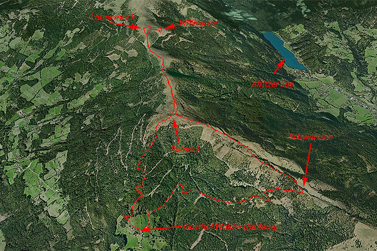 Lange geschlafen, nach dem wir am Vortag erst um Mitternacht angekommen sind. Wir suche n wie üblich ein bisschen, bevor wir den richtigen Weg zum Ausgangspunkt gefunden haben. Um kurz nach 12 starten wir beim Gasthof Walder; letztes Mal waren wir von Weißenstein bis hierher zu Fuß aufgestiegen. Hinter dem Gasthof geht's kurz am Rand einer Wiese aufwärts, dann sind wir im Wald. Wie hier üblich steigt der Weg steil an; zwischendurch queren wir Wirtschaftswege, der Steig selbst ge ht gerade aufwärts. Nach eineinviertel Stunde sind wir am Gipfel des Palnock; da Richtung Norden der waldfreie Kamm auf und ab über verschiedene Nocken bis zum Mirnock geht, beschließen wir dem Kamm zu folgen. Die Weideflächen mit den Kuhherden sind nur durch Holzzäune getrennt, auf der Kar te haben sie alle Namen (Tragenwinkler Alm, Bucheralm, Fleckeralm). Ab der Bucheralm lassen wir Willi frei laufen, was dieser nach kurzer Zeit beim Aufstieg zum Lahnernock ausnützt und ausbüxt. Eli folgt ihm als erstes und ich dann auch, aber bald (praktisch sofort) haben wir ihn aus den Augen verloren. Wir rufen und irren herum, aber nichts von Willi zu sehen oder hören. Schlußendlich taucht er dann wieder auf. Wir nehmen ihn nun wieder an die Leine und steigen alles, was wir auf der Suche nach Willi abgestiegen sind, wi eder auf und noch ein paar Meter mehr bis wir am Gipfel des Lahnernock sind. Gipfel ist ein bißchen hochtraben ausgedrückt, es ist der höchste Punkt des runden Nocks. Die nächsten zwei Gipfel (Lierzberger Alpenspitz und Rindernock) sind zum Greifen nac h, aber die Such nach Willi hat Zeit gekostet, so kehren wir um. Zurück am Palnock gehen wir Richtung Südosten zum Schwarzsee (kleine Lacke) und dann tauchen wir wieder in den Wald ein. An der Ambergerhütte, einer Jägerhütte, vorbei kommen wir immer weiter hinunter und sind bald am Bruggerhof, von dem es die letzten Meter aufwärts zum Gasthof Walder geht. Wir kehren wie letztes Mal ein, es gibt immer noch nur kalte Küche. So begnügen wir uns mit etwas trinkbarem, ich Hefeweizen und Eli Kaffee. Für Willi gibt's Wasser.