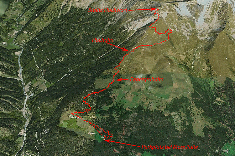 Um viertel nach Sieben in Meran gestartet; nach Kaffee in Stuls um 10 vor halb neun beim Parkplatz vor der Morx Puite los. Anfangs über geteerte Strasse, dann auf Steig durch den Wald mehrere Male die Stra sse schneidend. Es ist angenehm frisch und wir kommen relativ schnell voran. Bald sind wir bei der Eggergrubalm, bei der Bernd meist am Weihnachtstag zu Mittag einkehrt. Weiter gehts nunmehr oberhalb der Waldgrenze aufwärts bis zur Hochalm. Aufwärts und dann nach Osten querend bevor mit geringem Anstieg die gesamte Querung wieder in der Gegenrichtung absolviert wird. Von hier hat man e inen tollen Blick auf die Stuller Mahder; zu jeder zieht sich eine Zufahrtsstrasse (ungeteert). Als es wieder aufwärts geht, umfängt uns bald der Nebel und der Wind wird recht kalt. Die letzten Meter sind drahtseilgesichert über einen Felsaufschwung; Eli und ich umgehen mit Willi diesen Felsaufschwung und finden einen Anstieg größtenteils über Schrofen; ist einfac her für Willi. Am Gipfel bläst der kalte Wind und zu sehen ist auch nichts, so steigen wir ohne zu rasten und zu fotografieren schnell wieder. Bei Abstieg über die Schrofen löse ich einen Stein aus, der ungehindert in die Tiefe holpert. Eli besteht daraufhin, über die Felsaufschwung abzusteigen; Willi schafft mit Bernds und unserer Hilfe auch das. Am Umkehrpunkt der Querungen wartet eine ganze Herde von Geißen auf uns, Willi kläfft, aber das schreckt die Viecher nicht a b. Sie beobachten vor allem Willi genau, bevor der Hirte sie Richtung Hochalm weitertreibt. Wir rasten hier und essen etwas. Bald gehen wir weiter, da wir vorhaben bei der Eggergrubalm einzukehren. Dort bestellen wir uns Brennesselknödel mit gemischtem Salat und zum Nachtisch Apfelstrudel und Enzia n. Anschließend geht es weiter Richtung Auto. Auf der Alm haben wir erstmals mehrere Leute getroffen, vorher nur eine Familie im Abstieg von der Hochwart und eine Vierergruppe des AVS, die von der Hohen Kreuzspitze kommend, den Steig saniert haben. Diese sind dann mit dem Auto des Bergrettungsdienstes, das beim höchsten Mahder abegestellt war, zu Tale gefahren. Wie gesagt, ab der Eggergrubalm waren dann einige Leute unterwegs und auf der Morx Puite fand ein Kirchtag statt mit Musik und Goaselschnöllem.