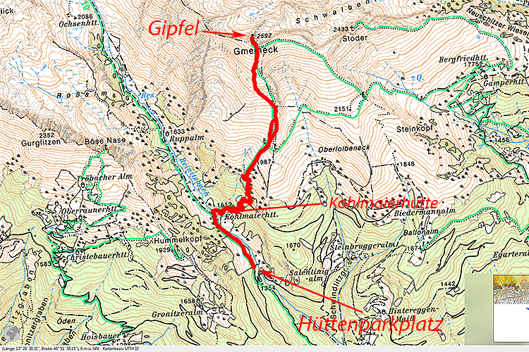 Bißchen verschlafen, daher erst etwas später los; außerdem war die Zufahrt ab Lendorf bzw. dem Ende der asphaltierten Straße noch ziemlich lange. So starten wir vom Parkplatz erst knapp nach 10 U hr. Bis zur Kohlmaierhütte ist es nicht weit und außerdem eher eben. Ab der Hütte dann der in den Nockbergen (obwohl das Gmeineck nicht dazu gehört) so übliche steile und direkte Anstieg. Zuerst durch den Wald, dann in einer Schneise, bevor es dann ober der Waldgrenze direkt zur Sache geht. Im Wald sind wir an zw ei Hütten vorbei, die beide geschlossen waren (eine davon zumindest dürfte eher privat sein). War es im Wald noch etwas kühler, so bekommen wir oberhalb die ganze Kraft der Sonne zu spüren; der Hang ist Südsüdwest ausgerichtet und so kann die Sonne praktisch den ganzen Tag hineinbrennen. Am Rücken zwischen zwei Gräben steigt der Weg weiter ziemlich direkt an und wir kommen ganz schön ins Schwitzen. Um die Kühe machen Willi und Eli einen schön en Sicherheitsbogen. Die Hänge sind um diese Jahreszeit noch schön grün; erst kurz unter dem Gipfel gehen die Grasmatten in Steinhänge über. Das Gipfelkreuz wird erst ganz zum Schluß sichtbar, aber nach knapp zwei einhalb Stunden ist es erreicht. Wir sehen auf das Drautal, Spittal und den Millstättersee sowie die Karawanken; in der anderen Richtung fällt der Blick auf das Reißeck (Namengeber der Gruppe) und weiter entfernt die Hochalmspitze (könnte zumindest sein, bin mir nicht ganz sicher). Willi ist durch die Hitze ziemlich KO und sucht den Sch atten, der aber nur spärlich vorhanden ist. Uns macht die Hitze auch zu schaffen; halten uns daher nicht lange auf und beschließen erst weiter unten, wo es Wasser gibt, zu essen. Wir haben beim Aufstieg den größten Teil unserer Flüssigkeitsvorräte verbraucht und den mageren Rest bekommt Willi. Abwärts geht's. Nach einer Stunde erreichen wir eine der Hütten; da dort ein Brunnen ist mit kühlem Wasser, setze n wir uns hin und rasten ausgiebig. Jetzt bekommen alle zu essen, einschließlich Willi, und auch kühles Wasser. Erst später steigen wir langsamer weiter ab und kehren bei der Kohlmaierhütte auf ein alkoholfreies Hefe (Franziskaner!!) ein. Bald danach sind wir wieder beim Auto und schleichen den ungeteerten Wirtschaftsweg gen Tale.