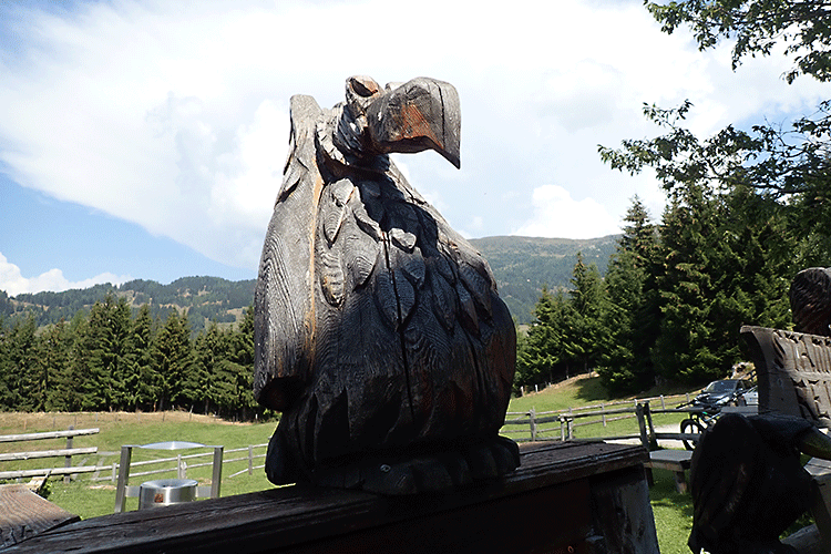 Um 10 Uhr geht es dann im Pulk los. Auf abgelegenen Teerstraßen nach Tangern und ab da auf einem Forstweg. Wir sind zwar eher langsam, aber da die G ruppe immer wieder rastet, vereinbaren wir mit dem Guide, dass wir ohne rasten einfach weiterfahren würden. Wir kurbeln die Forststrasse bergan, Kurve um Kurve, an der Abzweigung zur Pichlhütte vorbei un d gelangen dann, die letzten paar Meter über einen Steig schiebend, bis zum Aussichtspunkt Tangerner Alm. Die Aussicht über den Millstätter See ist von hieraus genial. Bald treffen so nach und nach die anderen ein. Wir rasten noch ein bißchen, bevor es über den Steig zur Pichlalm geht. Wie es sich herausstellt, sind ein paar komplette MTB-Novizen dabei, die eigentlich mit einer Tour auf Forststraßen gerechnet hatten (obwohl die Ausschreibung auf der Website ausdrücklich von einer Tour für Fortgeschrittene, S1, spricht) und nun etwas überford ert sind. Sie entschließen sich, die schwierigen Stellen schiebend zu überwinden. Wir anderen fahren den Trail ab. An der Pichlhütte angekommen, warten wir bis alle zusammen sind. Da einige Wasser im Bad der Hütte na chfüllen, schlage ich vor, uns hinzusetzen und etwas zu konsumieren. Eli und ich nehmen Kaffee und ein alkoholfreies Hefe. Rund um die Hütte sind einige nette Schnitzereien zu bewundern. Nach ca. einer Stunde (die Rast hat sich dann hingezogen) starten wir zur weiteren Abfahrt. Größtenteils auf dem Anstiegsweg, weichen wir nur im unteren Teil auf einen Wanderweg aus (siehe Karte). Bald sind wir dann wieder in Tangern und rollen in leichtem Auf und Ab nach Millstatt.