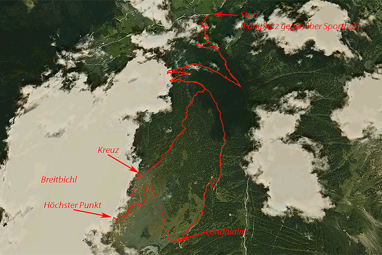 Der Wetterbericht hat für heute starken Nordwind vorhergesagt und der Lawinenlagebericht hat 3 ausgegeben (Was der Südtiroler Lawinenla gebericht auch immer wert ist). Wir mussten also ein Ziel aussuchen, dass größtenteils unter der Waldgrenze liegt und wo darüber nicht zu steil ist. Also der Breitbichl, der klassische Schlechtwetterschitourenberg. Um acht in Meran und um neun beim kleinen Parkplatz gegenüber dem Hotel Sporthof los. Ich steige mit den Schi direkt den Hang hinauf und Eli und Bernd gehen die Strasse zu den Höfen aus. Bin nur knapp schneller als sie. Weiter geht's auf dem Forstweg ins Klapfbe rgtal. Bald ist die Abzweigung zur Londaialm erreicht, der wir folgen. Nach zwei Kehren geht die Spur von der Strasse ab und wie üblich relativ steil durch den Wald direkt Richtung Breitbichl. Eine Gruppe hat uns überholt. Ich habe ein bisschen Probleme mit meinen Fellen (Colltex CT 40) die ziemlich rutschen; klebe n übrigens auch schlecht. Werde sie nach der Tour ersetzen durch ein Mischfell, vielleicht ein Black Diamond. Wie erwartet bläst oberhalb der Waldgrenze der kalte Nordwind. Die Schneedecke ist abgeblasen. Bald sind wir am Kreuz und entscheiden uns trotz des Windes noch weiter zu den nächsten beiden knapp höheren Erhebungen weiter zu gehen. Der Wind bläst uns fast von den Beinen und alte Schispuren sowie die Stockeinsätze sind vom Wind freigeblasen und stehen hervor. Auch am höchsten Punkt angekommen halten wir uns nicht lange auf, so ndern machen uns sofort auf den Abstieg bzw. Abfahrt zur Londaialm. In den windgeschützteren Teilen ist sogar noch etwas Pulver. An der Londaialm angekommen, machen wir es uns bequem und lassen uns im Windschatten von der Sonne wärmen. Wir halten uns fast eine Stunde dort auf. Kurz b evor wir losstarten, kommen zwei Schneeschuhgeher aus dem Klapfbergtal zur Alm. Ich fahre voraus und bin nach knapp 35 Minuten beim Auto; Eli und Bernd brauchen mit den Schneeschuhen nur knapp eine Stunde länger.