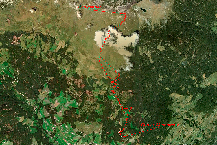 Nachdem Samstag wettermäßig eher schlecht war, sollte der Sonntag besser sein (sonnig, aber mit kaltem Nordföhn). Für die erste Schitour der Saison war der Königanger gerade richtig. Nicht zu weit zu fahren, sicher und auch der Schnee sollte kein Problem sein. Sicherheitshalber hatte ich auch die Schneeschuhe ins Auto geworfen; waren aber nicht notwendig, da bereits vom Parkplatz beim Garner Wetterkreuz weg der Forstweg eine Schneeauflage hatte.