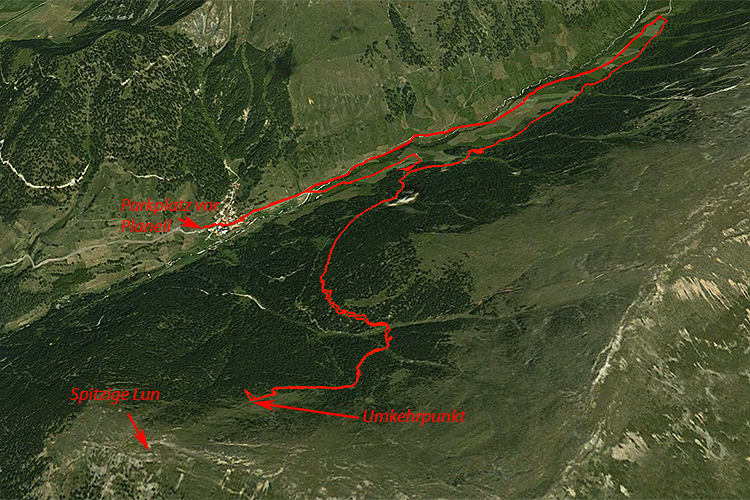 Mein Kreuz macht mir weiter Probleme, so haben wir eine kleine Tour ausgesucht und zwar ursp rünglich die Spitzige Lun von Planeil aus (so wie im Spätherbst mit Bernd). Wir haben uns am Morgen Zeit gelassen und sind erst um 20 nach 10 vom Parkplatz vor Planeil gestartet. Anfangs über Forstweg auf dem kaum Schnee lag; später auf Steig auf dem deutlich mehr Schnee lag. Bis zur Waldgrenze ging es relativ problemlos; wir alle inklusive Willi sind immer wieder mal eingebrochen, aber wie gesagt kaum ein Problem. Wir haben dann an der Waldgrenze die Schneeschuhe angezogen, aber bald darauf ist klar geworden, dass Willi, der ja keine Schneeschuhe hat, dauernd einbricht. Da er in letzter Zeit Probleme mit dem rechten Hinterlauf hatte (Lähmungserscheinungen), haben wir nichts riskiert und sind knapp 150 m unterhalb des Gipfels umgekehrt. Bald waren wir wieder fast unten. Wir haben dann beschlossen noch ein Stück talein zu gehen, auf dem Panoramaweg Plan eiler Alm. Nach insgesamt 3 Stunden unterwegs machen wir dann Rast und essen unsere Brote, die Schokolade und die Riegel. Auch für Willi haben wir Futter mitgenommen. Nachdem alles ratzeputz vertilgt wa r, ging es weiter. Als der Panoramaweg den Wirtschaftsweg ins Tal schneidet, nehmen wir den Weg talaus. Nach fast 5 Stunden reiner Gehzeit sind wir gegen 16 Uhr wieder am Auto. Auf der Rückfahrt haben wir dann so fast alle Sonntagsfahrer getroffen, die unterwegs waren. Manche Leute verwechseln die Straße mit ihrem Bett!