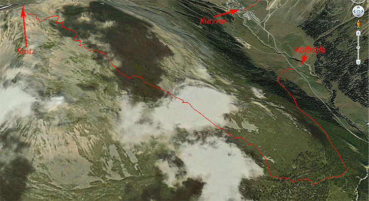 Start bei den Köflhöfen um 20 vor neun, vor uns starten schon einige andere, die aber, wie wir später merken nicht auf den Stotz gehen, sondern Richtung Lagaunspitze. Der schmale Steig bis ins Laga untal ist im Aufstieg trotz einiger Steilstücke problemlos. Bevor wir ins Lagauntal kommen, zweigt die Spur ab und zieht durch den Wald nach rechts. Die Spur ist teilweise verweht, was uns wundert, da vor uns einige gestartet sind. Als der Blick oberhalb des Waldes frei wird, sehen wir eine größere Gruppe Richtung La gaun gehen und zwei Schitourengeher kommen aus dem Lagauntal und erreichen die Anstiegsspur ein Stück vor uns. Wahrscheinlich sind sie der Gruppe gefolgt und haben dann eine eigene Spur gelegt, als sie merkten, dass die anderen nicht zum Stotz wollten. Das Wetter ist schö n und im Windschatten ist es auch warm. Der Gipfelhang ist etwas steiler und wird in ein paar Spitzkehren überwunden. Die beiden, die vor uns den Gipfel erreicht haben, sind bereits wieder abgefahren als wir ankommen. Nach uns kommen weitere Schitouren und Schneeschuhgeher zum Gipfel. Wir lassen uns Zeit und genießen Aussicht und Tag. Die anderen Schitouren gehern starten vor uns zur Abfahrt. Der Schnee ist, wie zu erwarten war, teilweise recht gut und teilweise brüchig. Nach ausgiebiger Rast machen auch wir uns an die Abfahrt (Karin und ich) bzw. Abstieg (Bernd auf Schneeschuhen). Wie wir bereits bei den anderen gesehen haben, ist der Schnee nur in einigen Bereichen schön zu fahren; macht aber nichts. Zwischendurch warten wir immer wieder auf Bernd, der ebenfalls recht flott unterwegs ist. Der Teil durch den Wald bis zum St eig ist zwar besser was den Schnee angeht, aber ansonsten vorsichtig zu fahren. Der Steig ist besser als erwartet; da die meisten in den Steilstücken abrutschen, ist der Steig auf seiner gesamten Breite angefahren und stellt somit keine Probleme dar. Bald sind wir wieder beim Auto; Bernd braucht nicht viel länger.